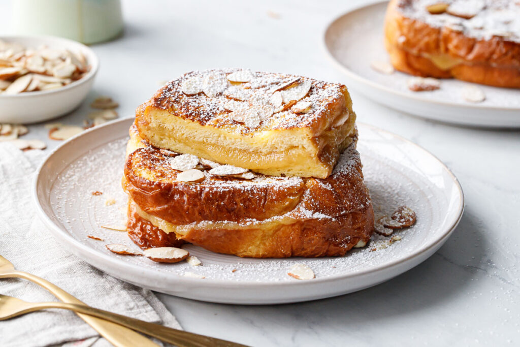 Что не нравится: сливочно-миндальная начинка, зажатая между двумя толстыми ломтиками маслянистой булочки, затем пропитанная яично-молочным заварным кремом и обжаренная на сковороде для идеального золотисто-коричневого цвета и хрустящей корочки. Посыпанный поджаренным миндалем, посыпанный сахарной пудрой и сбрызнутый кленовым сиропом, это идеальный рецепт позднего завтрака, о котором вы никогда не подозревали, что вам нужен.
