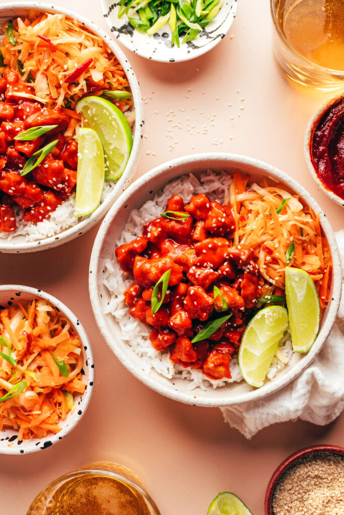Это простое и вкусное блюдо на растительной основе в сочетании с рисом и яблочной капустой, а также оно будет восхитительным в чашках салата или подается с нашими хрустящими рисовыми оладьями с кимчи!