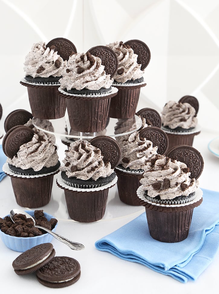 Вот десерт на все случаи жизни! Кексы Oreo сделаны из нежного сметанного торта с темным шоколадом и покрыты высоким завитком печенья и кремовой глазурью. Выпекайте эти кексы в форме для кексов стандартного размера и заполняйте их тестом только наполовину. Эти кексы немного поднимутся в духовке, но не будут куполообразными в центре. Их влажная текстура придает им высокий уровень. Готовность проверяйте с помощью тестера-зубочистки, вставленного в их центры. Рецепта глазури достаточно для высокого тройного вихря масляного крема. Рецепт можно уменьшить вдвое для более скромного количества глазури.