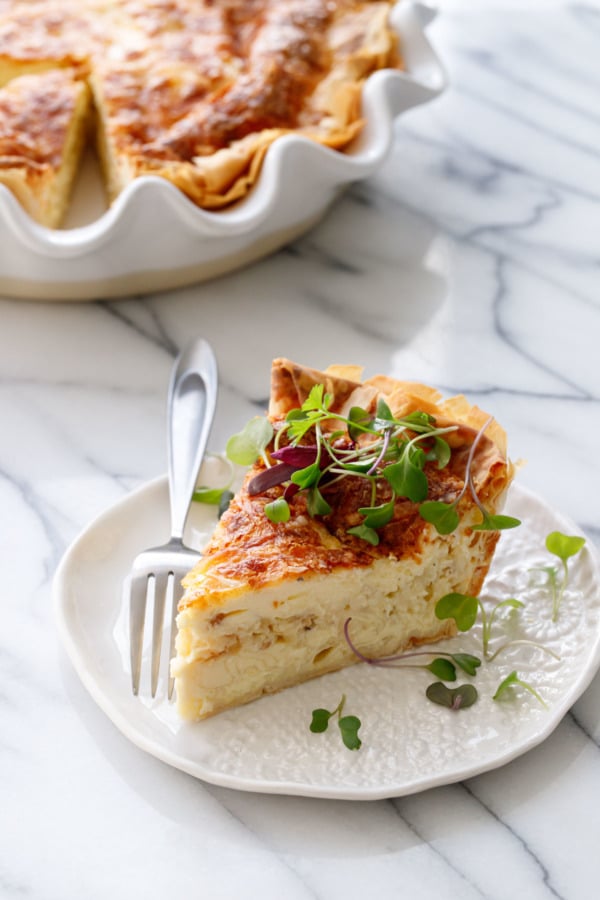 Вкус этого пирога с заварным кремом представляет собой сочетание золотисто-коричневого карамелизованного лука с плавленым ореховым сыром и ультра-чешуйчатой корочкой из теста филло. Вроде как лучшая часть французского лукового супа — это плавленый сыр сверху? Здесь присутствует та же общая комбинация вкусов.