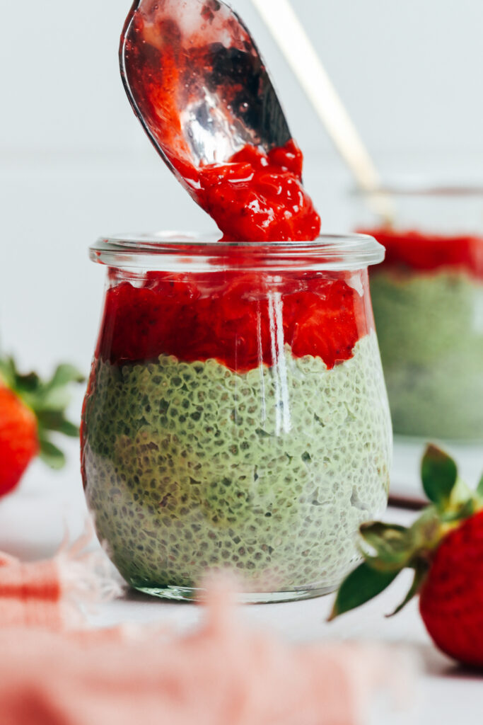Только что пришло время перекусить оглушительный! Представляем вам густой сливочный пудинг из чиа MATCHA с ярким компотом из свежей клубники. Это вкус только как волшебно, как это выглядит! Кроме того, он упакован с волокно и полезные жиры (привет, омеги!) благодаря чудесным семенам чиа.