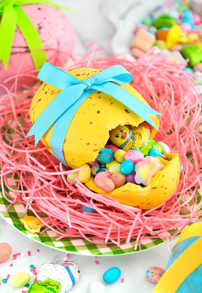 Вскройте это конфетное пасхальное яйцо, и внутри вас ждет сюрприз! Это разбиваемое яйцо веселее, чем открывать пасхальную корзину (если вы спросите меня). Оболочки легко сделать с помощью силиконовой формы и плавящихся вафель на ваш выбор цвета. Используйте мою технику разбрызгивания шоколада для пятнистости яичной скорлупы, или вы можете пропустить этот шаг для более простой простой яичной скорлупы. Вам понадобится около 1 1/2 – 2 чашек маленьких конфет, чтобы заполнить яйцо. Я использовала завернутые в фольгу яйца, яйца из солодового молока, желейные бобы, зефир, мармеладные кролики, посыпку, маленьких полых пасхальных цыплят и ягнят Lindt, посыпку и другие маленькие леденцы. Выбрать конфеты — половина удовольствия!