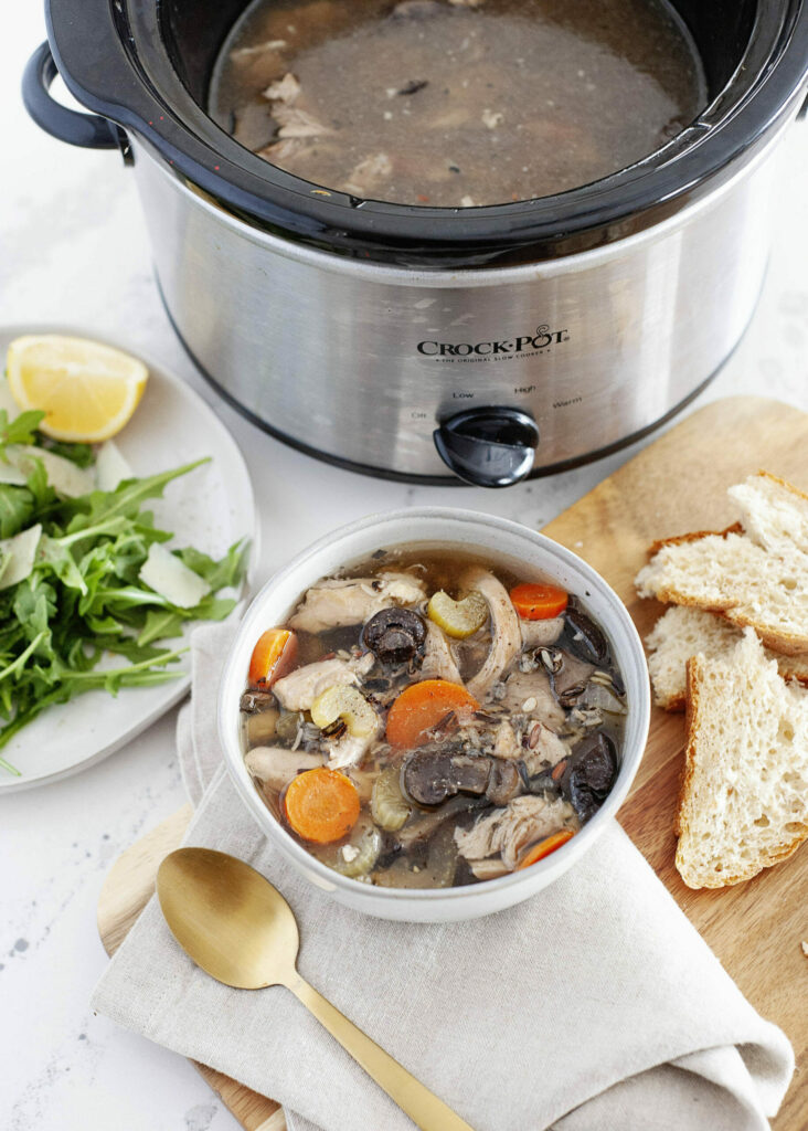 Этот успокаивающий суп из курицы и риса в медленноварке имеет стандартную основу для куриного супа — морковь, сельдерей, куриную грудку, куриный бульон — но с добавлением лука-шалота, грибов кремини и прованских трав для более глубокого и насыщенного вкуса. Смесь из дикого риса быстрого приготовления делает блюдо сытным, но не тяжелым, и добавляет зубастый вкус, которого просто не может обеспечить лапша.