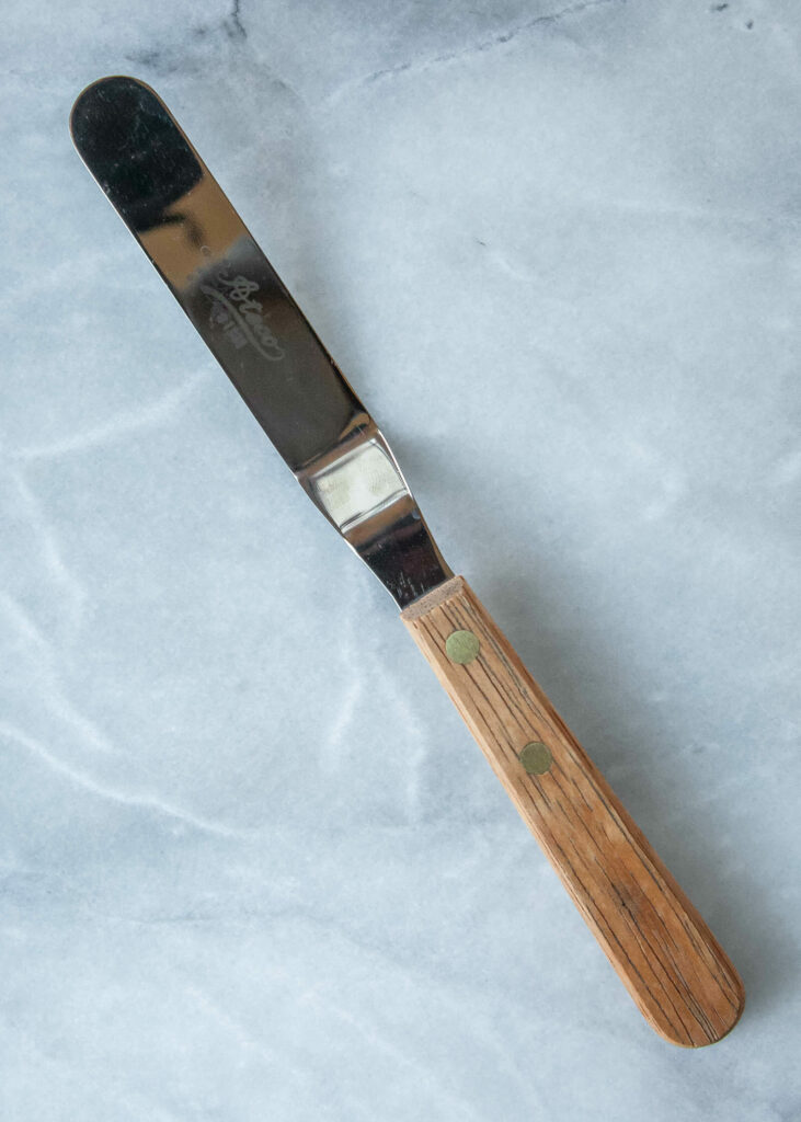 У меня были разные офсетные шпатели в течение многих лет, но с тех пор, как я начал серьезно печь, офсетный шпатель Ateco 4 1/2 дюйма (6 долларов от Amazon) — это тот, к которому я добрался больше, чем все остальные в моем ящике. Он достаточно большой, чтобы собрать приемлемое количество глазури или переместить значительное количество теста, но не настолько велик, чтобы его было неудобно использовать.