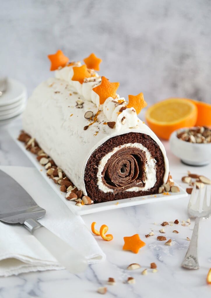 Я не мог пропустить сезон, не наслаждаясь одним из моих любимых проектов рождественской выпечки — тортом из полена, также известным как «Рождественское полено». Бюш де Ноэль. Это то, чего я с нетерпением жду каждый год. Раньше, весной, вдохновение пришло, когда я просматривал журнал кондитеров. Я видел бисквитный рулет с блинчиками, завернутыми внутрь. Это напомнило мне немного кольца деревьев. Я знал, что должен попробовать эту технику на себе. И я просто знала, что из него получится фантастически выглядящий рождественский торт.