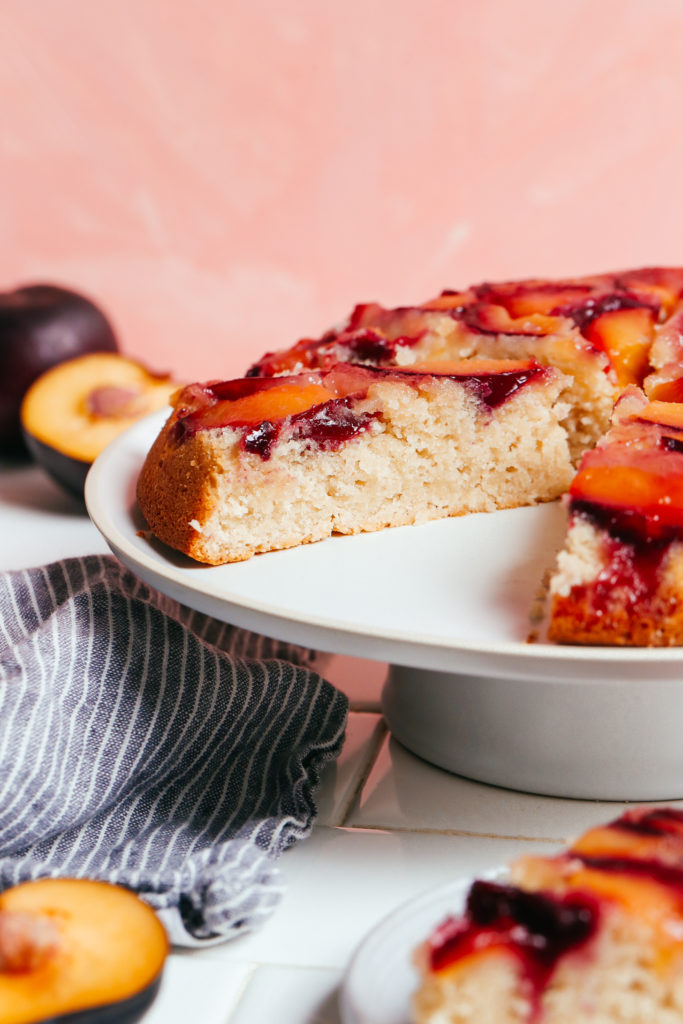 • Когда будете готовы перевернуть торт из формы, используйте любую тарелку для торта, на которой вы планируете его подавать. Поместите тарелку для торта нижней стороной вверх на форму для пирога. Аккуратно и уверенно переверните торт на тарелку. Аккуратно снимите форму для пирога, вернув оставшуюся сливу обратно в пирог. Подавать теплым или комнатной температуры. Торт хорошо сочетается с безмолочным йогуртом для утреннего чая или поздним завтраком или с ванильным мороженым на десерт!